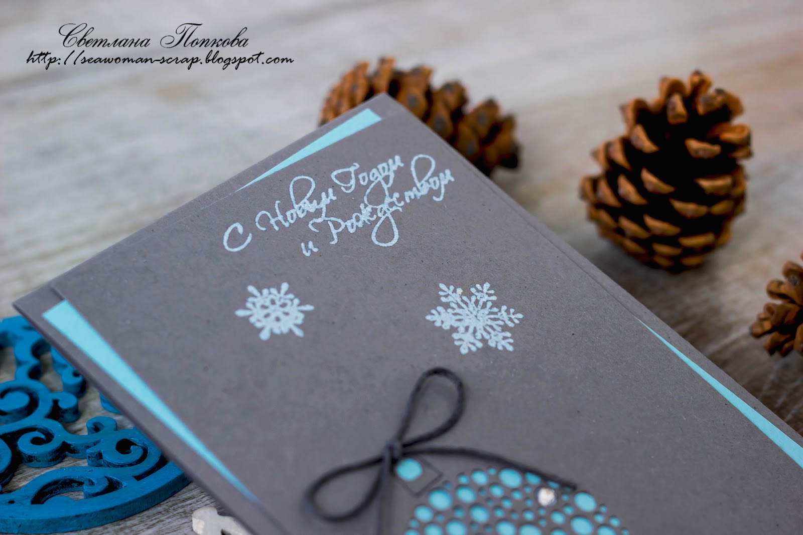 Синяя выполнена из рельефной бумаги, на ней очень красиво смотрятся отштампованные снежинка и надпись, покрытые серебряной пудрой для эмбоссинга. Серая, напротив, выполнена из перламутрового картона, надпись и снежинка отштампованы черными чернилами, снежинку дополняет посередине страза.